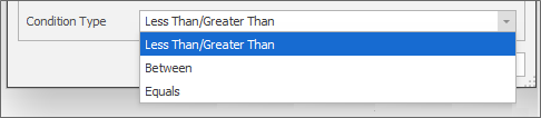 When a Numeric attribute has been selected, select a condition type. Conditions are automatically generated using the condition type and the parameters you have specified, however you can edit the conditions for individual colour entries.