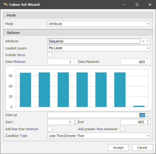 When the mode is set to Attribute in the Colour Set Wizard: Colour entries are generated based on a specified data range and number of intervals.