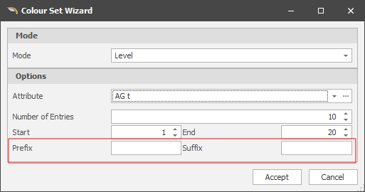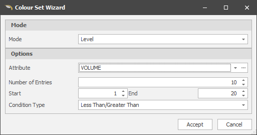 When the mode is set to Level in the Colour Set Wizard: Colour entries are generated based on a specified number sequence (Start number, End number, Number of entries).