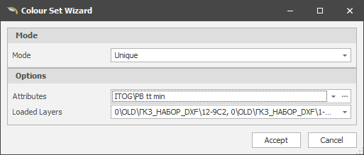 When the mode is set to Unique in the Colour Set Wizard: Colour entries are generated for each unique attribute value or unique combination of attribute values (when more than one attribute is selected).