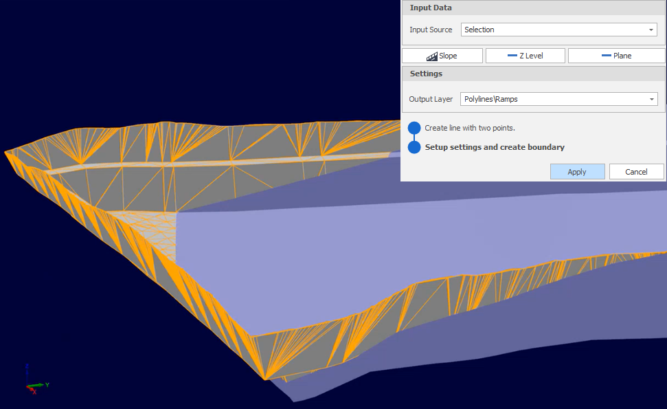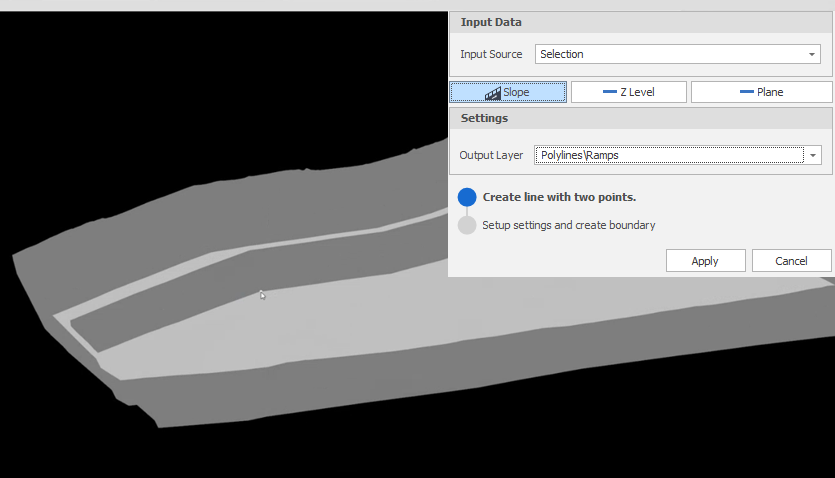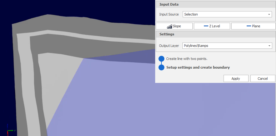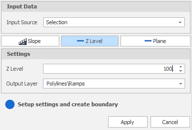 The Text Edit box can also be used to create or edit a plane from a string. The string format shows the plane selection mode and a zero or non-zero (if specified) offset value, followed by the elevation value.