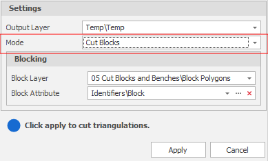 When Cut Blocks is selected as the mode in the Cut Blocks & Benches dialog, specify the following inputs: