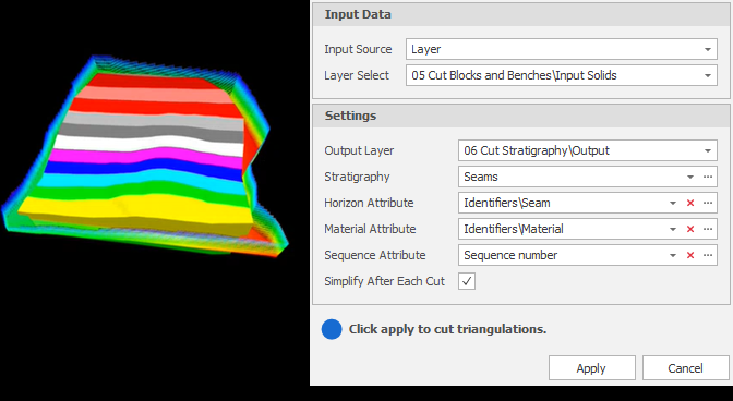 Material names in the chosen Stratigraphy can be written to the Output solids as a Material attribute.