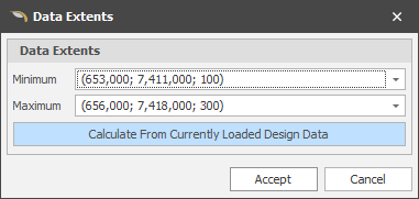 Alternatively, if design data is loaded, a button is enabled which allows you to quickly calculate the data extents from the extents of the currently loaded data. You can then manually adjust the Minimum and Maximum extents, if required.