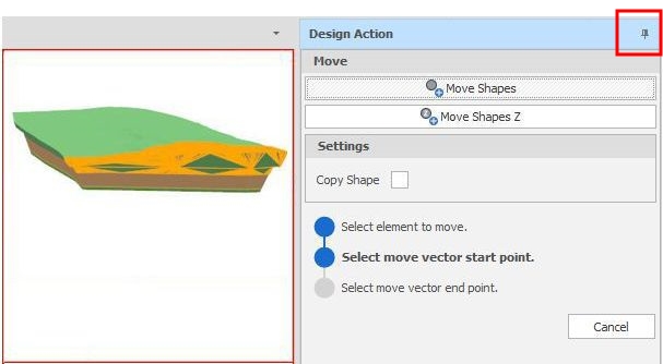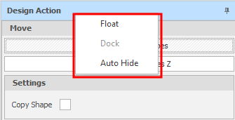 When a docked design action panel is unpinned (Auto Hide is ON), a caption for the current design action is shown: