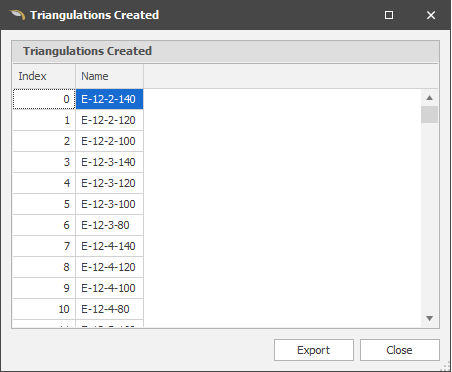 Once the files have been exported, a list of named triangulations are listed in a Preview window: