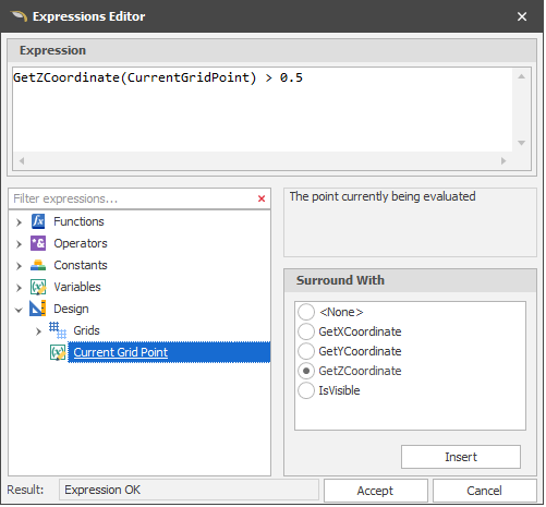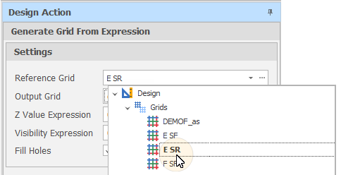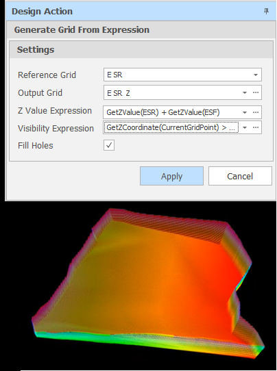 The tool will process all visible and invisible points of the reference grid and apply a Z value to each XY point based upon the Z expression you enter. This might be a constant Z value, or Z values referenced from another grid or grids.