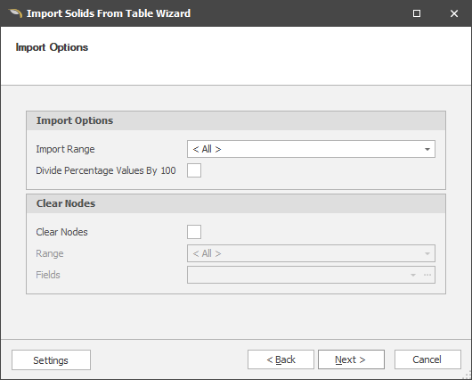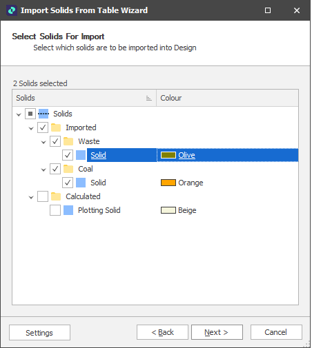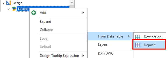 To import Solids from a Table and display them as a Design Layer: In the Design Data pane, right-click on the Layers node or the name of a layer and select Import | From Data Table.