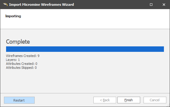 Click Next to begin the import. A summary of the wireframes and attributes created (or skipped) is displayed.