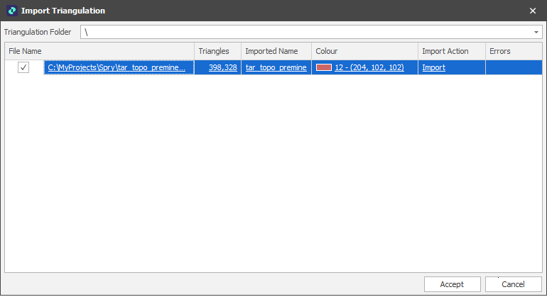 The file you have selected is listed in the Import Triangulation window. From here you can: