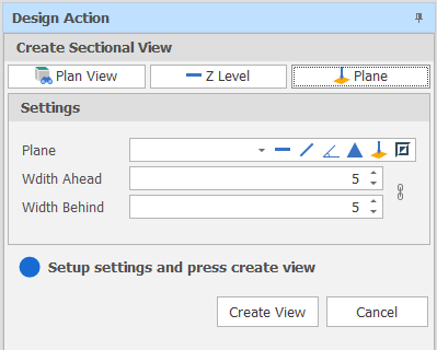 Set the section width by specifying Width Ahead and Width Behind values. These values define the extents of a “data corridor”. In Sectional View, Ahead is a measurement taken from the section line towards you, the viewer. Behind is a measurement taken from the section line away from you.