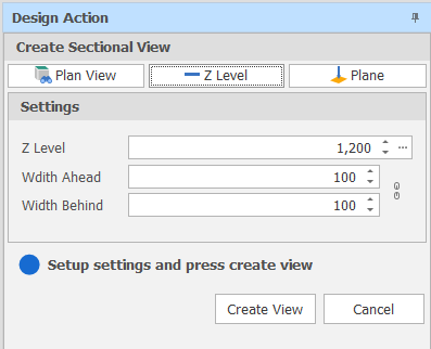 Set the section width by specifying Width Ahead and Width Behind values. These values define the extents of a “data corridor”. In Sectional View, Ahead is a measurement taken from the section line towards you, the viewer. Behind is a measurement taken from the section line away from you.