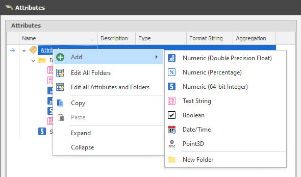 Numeric (Double Precision Float, Percentage, 64-bit Integer), Text, Boolean, Date/Time and Point3D attributes can be added.
