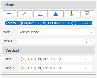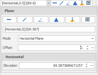 The Text Edit box can also be used to create or edit a plane from a string. The string format shows the plane selection mode and a zero or non-zero (if specified) offset value, followed by the elevation value.