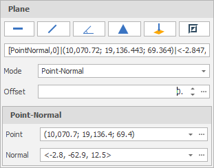 The Text Edit box can also be used to create a plane from a string. The string format shows the plane selection mode and a zero or non-zero (if specified) offset value, followed by the string format used for the conversion, which is “(x, y, z) | <a, b, c>“ where each lettered character can be a decimal number. (x, y, z) refers to the point of the plane. <a, b, c> refers to the vector normal of the plane.