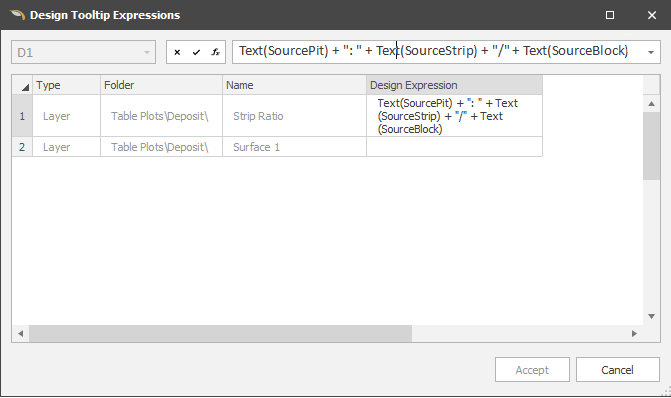 In the Design Tooltip Expressions window, the Design Expression for each layer (row) can be selected and edited: