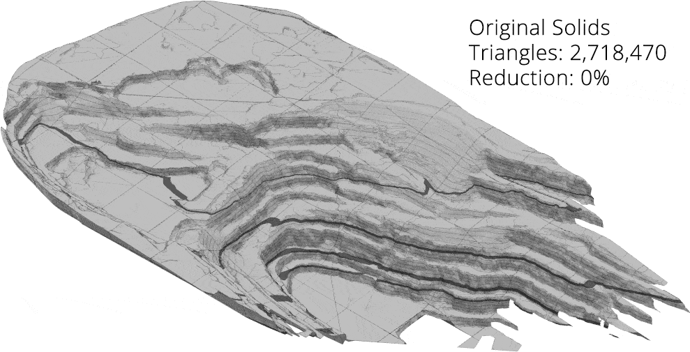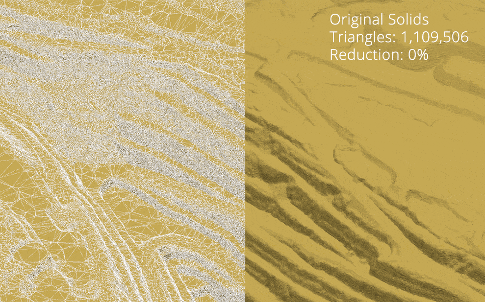In addition, common triangulations such as topographies are often imported with a similarly high level of detail. Solid Simplification reduces the complexity of any Solid or Triangulation by use of one of three methods (Point Collapse, Edge Collapse and Convex Hull) which has the following benefits: