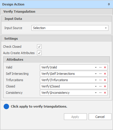 The results of the verification process are written to special attributes you create and select or auto-create. The Verify process checks for Valid topography, Self-intersecting triangles, Trifurcations, Closure (when the Check Closed check box has been selected) and Consistency. See: Setup Attributes