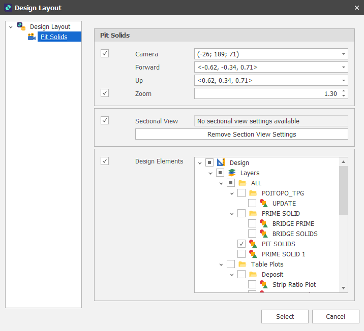 Select the check box to include design elements in the view. You can then select the design layers to include.