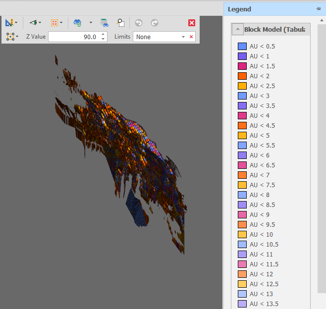 The colours and the filter you have applied to the block model on the Block Model Properties > Filter tab are also applied to a tabbed Legend panel: