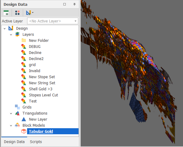 A new Block Model Layer now allows block model data to be imported, loaded and manipulated as Design Elements in the Design Window. This is supported by the introduction of dedicated Block Model Fields and Properties.