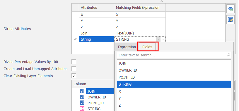 When you import design strings or solids, there are now two ways in which to match the attributes you want to import to fields in the project. In addition to clicking the ellipsis button to build a field expression in the expression editor, you can now click the drop-down to select a Matching Field for each import attribute: