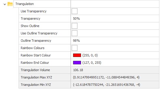 Volume (will only show if it has been manually calculated, or the triangulation properties have been calculated elsewhere. You can now right-click in the Volume cell to manually calculate the Volume)
