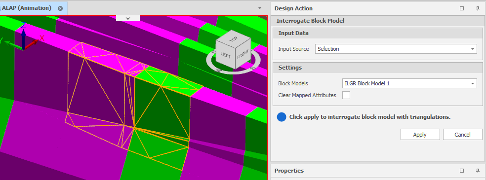 Interrogate Block Model allow you to generate quality values from one or more Block Models and populate the attribute values of the design elements you have selected. A pre-requisite is that the quality fields you want to interrogate (Gold Grade and Density, for example) have already been mapped to those attributes on the Interrogation tab of the Block Model Properties.