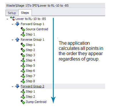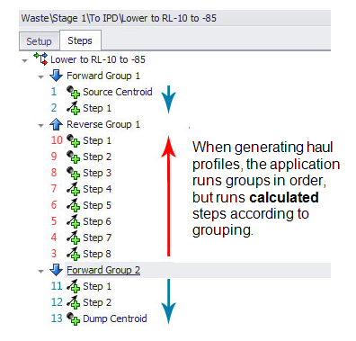The second stage generates the Haul Profile that the trucks will drive over. This stage uses only steps that are set as "Add to Profile" and moves through each group one at a time in the order set as either Forward (drive top to bottom) or Reverse (drive from bottom to top).