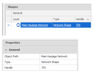 Right-click on the Haulage Network layer and select Design | Properties to view the General properties of the Network Layer and the properties of one or more Network Shapes.