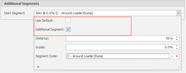 A Default Start/End segment can be specified at the start and end of haulage (these defaults are set on the Haulage tab of your Scenario Settings).
