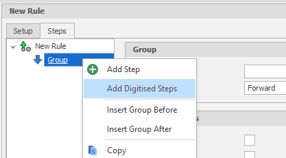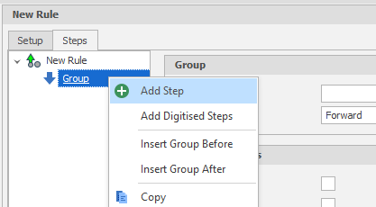 A central concept of Haulage Logic is grouping, where the steps in a rule are grouped and ordered (see Groups & Direction). If a Group does not yet exist, right-click on the name of a Rule and click Add Group. Once you have at least one Group, you can add steps to that group.