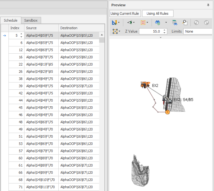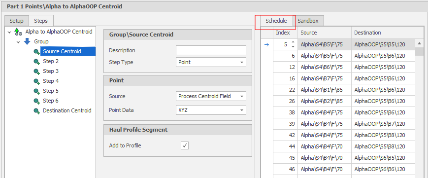 If you don't see any Steps on the Schedule tab, either Run your Scenario (or Generate Haul Profiles for the Current Rule) to populate the Output Schedule, or adjust the Filter.