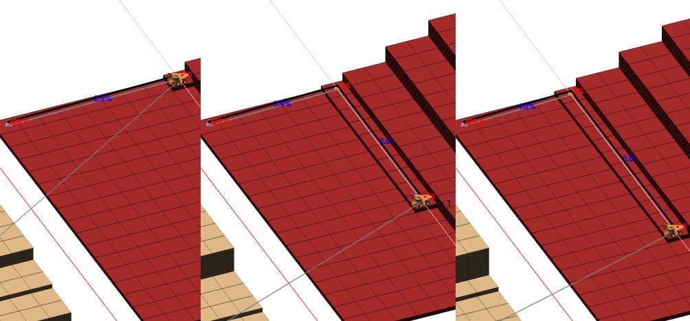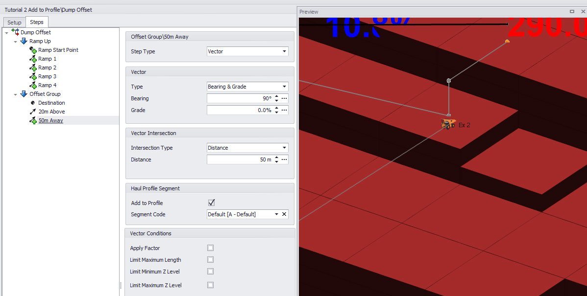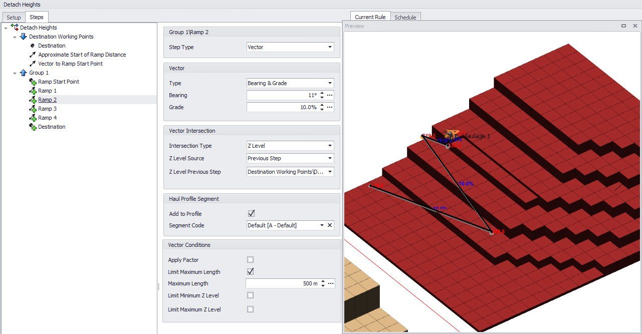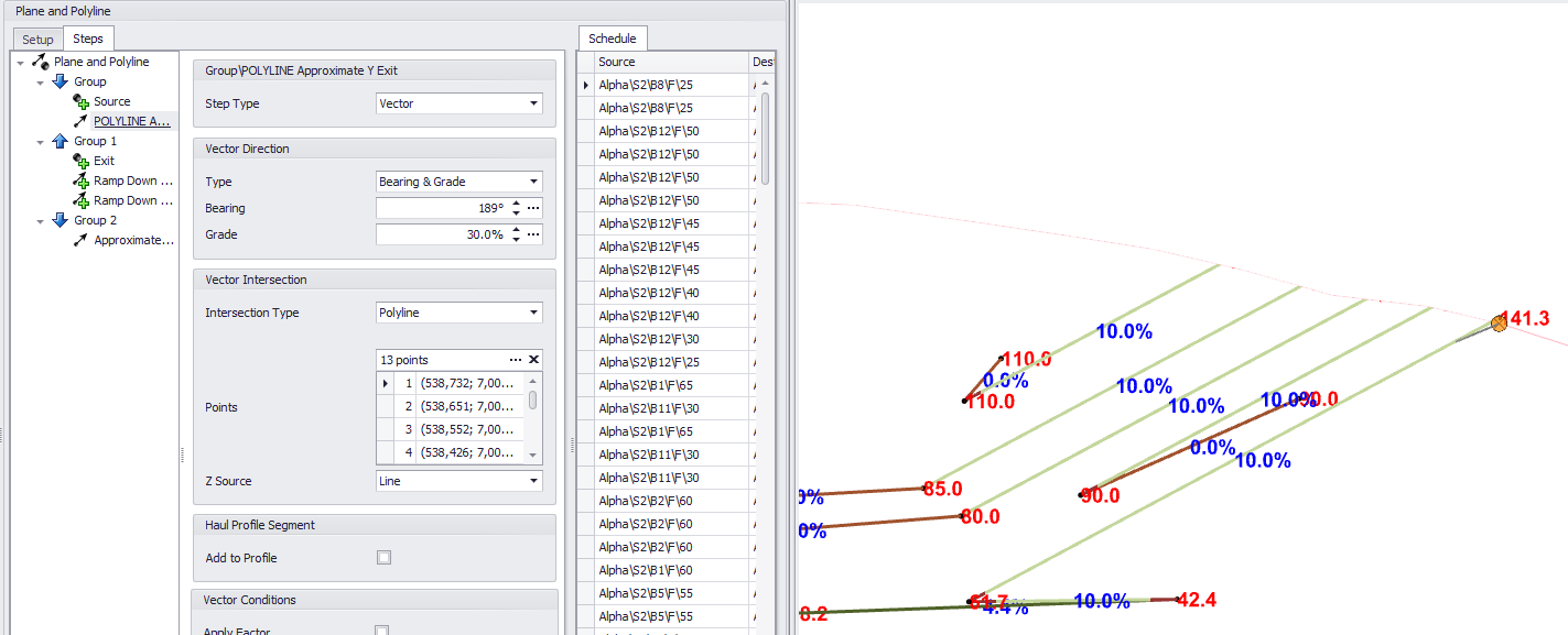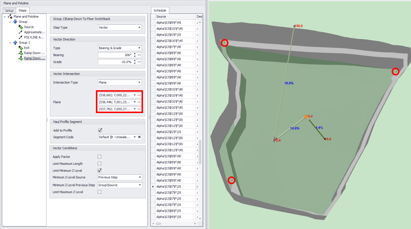 A vector that doesn't intersect essentially becomes a null vector (it goes nowhere and duplicates the point from the step before). This is actually really useful! You can get creative with what are essentially conditional vectors such as "only move to the right if further left than point X" or "ramp EITHER up or down to a Z level" by stacking vectors on top of each other (see examples in the tutorial file). In the Z Level intersection example above we have multiple ramps that intersect with the Z Level of the dump centroid. However, once the Z Level has been intersected, no more points are generated.