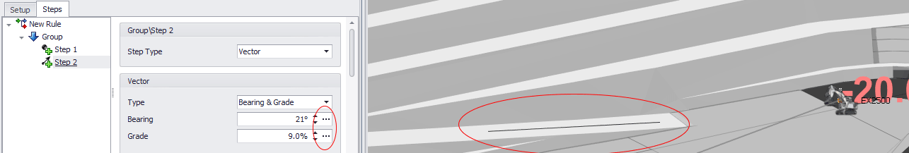 Bearing & Grade Vectors use the step before and you can set both properties using the ellipsis [...] button and drawing on your Animation Preview.