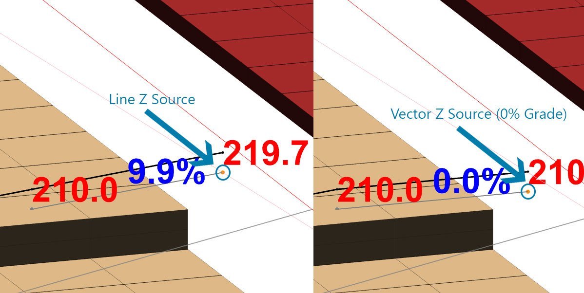 The second Z Level Source you can set for this intersection type is "Vector". That means no matter what Z Level your line is on, your vector will intersect with the Z level that is consistent with the Grade you set earlier. A common use of this is heading towards the edge of a pit which is deepening over time. See a comparison of the two Z Level Sources below.