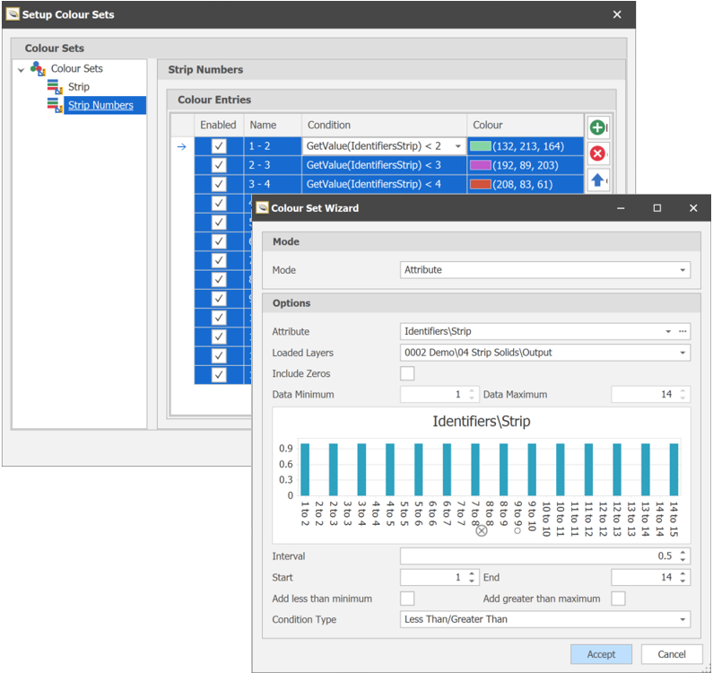 At this point, the Apply Colour Set tool and the Colour Set Wizard can be used to colour the strip surfaces by Strip attribute.