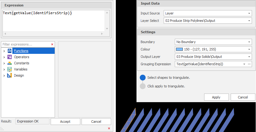 Once strip polylines have been attributed, offset and projected, the next step is to use the Create Triangulation tool to generate strip surfaces. The Strip attribute that was assigned to the strip lines is referenced in a Grouping Expression to create the surfaces.
