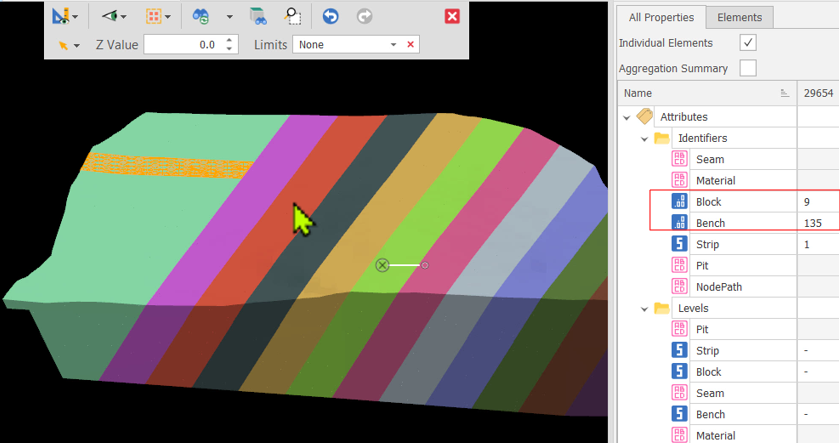 After using the Properties window to verify that the Block attribute has been populated for all of the block polygons, the strip solids and the block polygons are supplied as inputs to the Cut Blocks & Benches tool.
