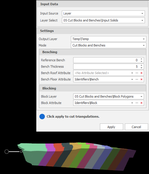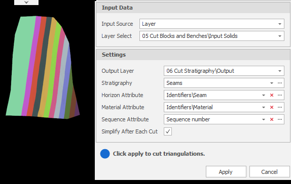Once Strip, Block and Bench solids have been cut, the final step is to Cut Stratigraphy into those solids.
