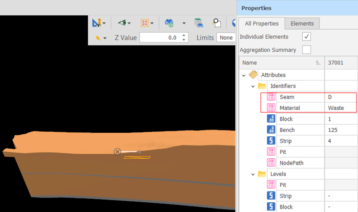 The Cut Stratigraphy function generates a new set of solids by cutting seams into the input solids. The Properties pane can be used to verify that the Horizon (Seam) and Material attribute values of the stratigraphy have been written to the new solids. Once Strip, Block, Bench and Stratigraphic solids have been cut, they can be loaded into a Data Table ready for Scheduling.