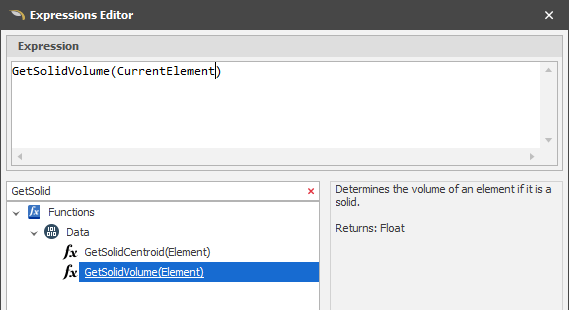 To write Volume attribute values to selected solids, the Set Attribute by Expression function is used. As the name suggests, an expression is used to calculate the volume of the selected solid or solids, for example: