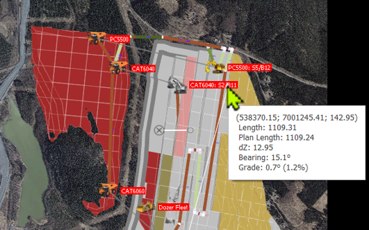 To determine the parameters to apply to project the strip lines up to a Z level above the top of the pit, the Measure tool can be used in Smart Snap mode and with appropriate Limits set for Distance, Bearing and Grade.