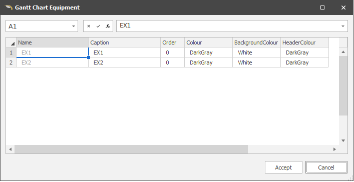 Those parameters might be the equipment items you have listed for inclusion in a Gantt Chart, the Colour entries you have added in the Colour Set Setup window, or the attributes you have defined for your design elements in the Design Window Properties pane.