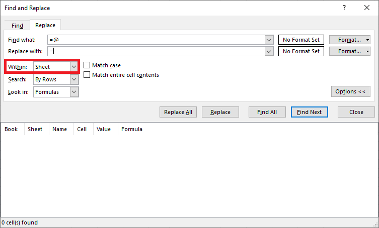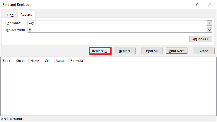 Enter "=@" without the quotation marks into the Find what field, then enter "=" without the quotation marks into the Replace with field and click Replace All