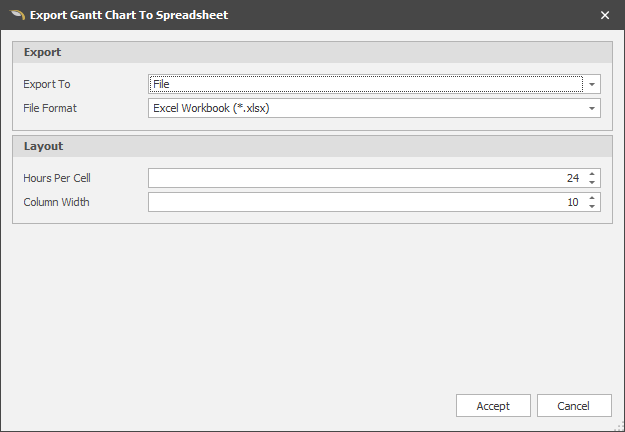 When a Gantt Chart is open, select Export | To Spreadsheet (from the Import/Export menu on the application window title bar) to export the Gantt Chart to an Excel Spreadsheet.