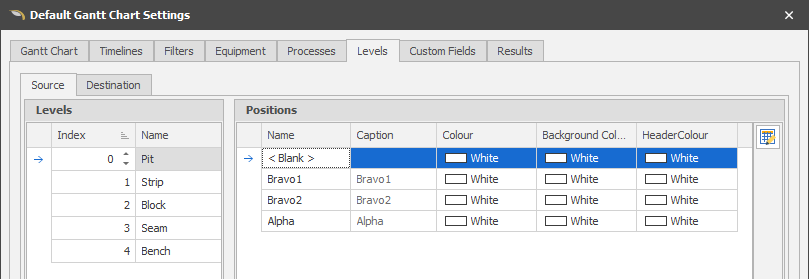 Use the Levels tab of the Gantt Settings window to control the colours and hidden tags of the level or levels shown on the chart.