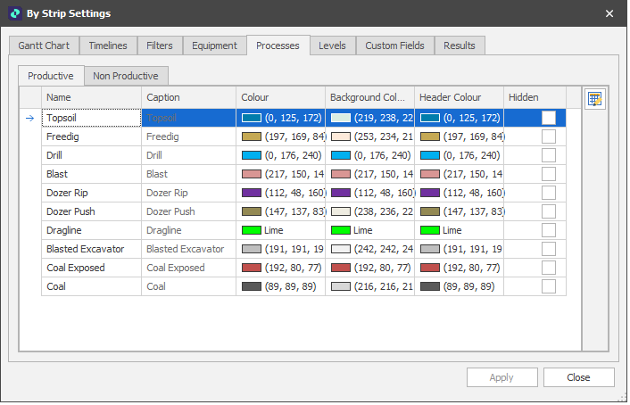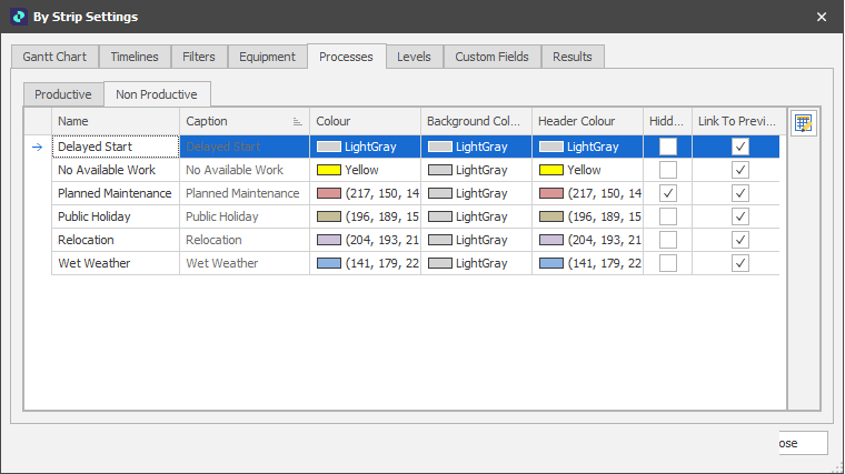 Use the Processes tab of the Gantt Settings window to control the colours and hidden tags of the Productive and Non Productive processes shown on the chart.