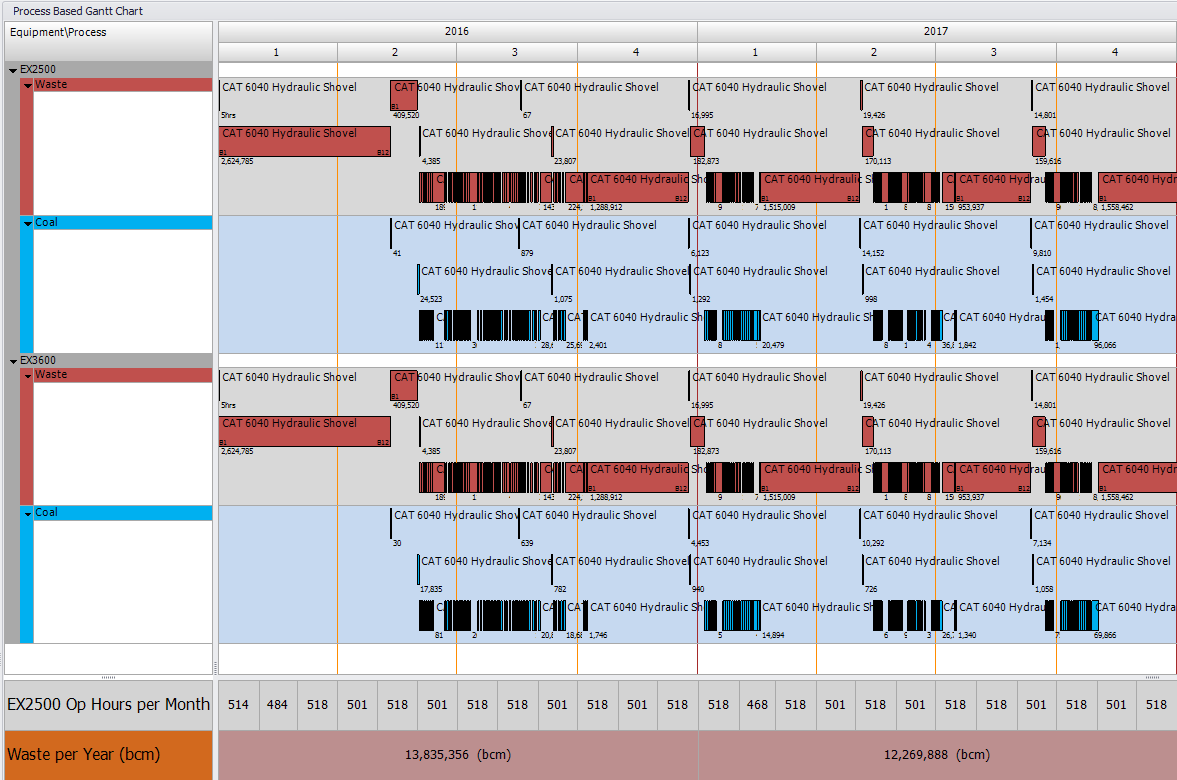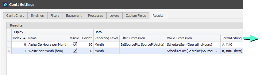 Use the Results tab of the Gantt Settings window to present rows of results at the bottom of your Gantt Chart split by Reporting Period, such as Operating Hours, Source Quantity and Value Custom Fields.