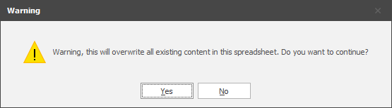 Caution: The Import will overwrite the contents of your current spreadsheet. You will be prompted to click OK or Cancel.